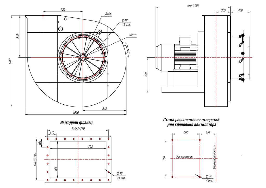 | Температура перемещаемой среды, °С | Скорость вращения, об/мин. | Номинальная мощность, кВт | Номинальный ток при 380В (50 Гц), А | Тип электродвигателя * | Производ. Q min, тыс. м3/ч | Производ. Q max, тыс. м3/ч | Полное даление Pv min, Па | Полное давление Pv maх, Па | Масса вентилятора, кг |