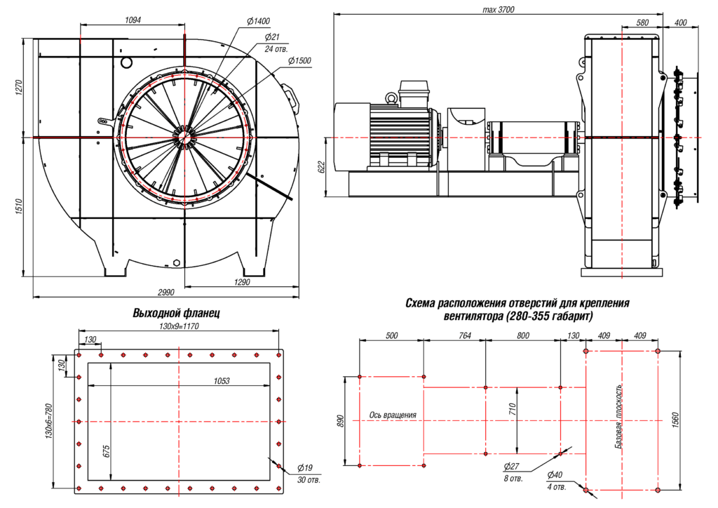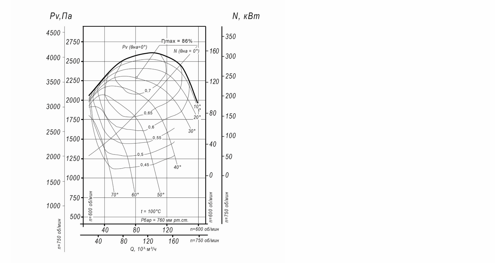| Температура перемещаемой среды, °С | Скорость вращения, об/мин. | Номинальная мощность, кВт | Номинальный ток при 380В (50 Гц), А | Тип электродвигателя * | Производ. Q min, тыс. м3/ч | Производ. Q max, тыс. м3/ч | Полное даление Pv min, Па | Полное давление Pv maх, Па | Масса вентилятора, кг |