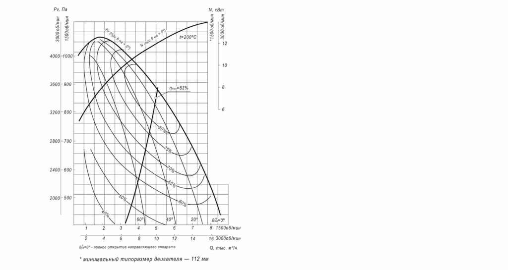 Температура перемещаемой среды, °ССкорость вращения, об/мин.Номинальная мощность, кВтНоминальный ток при 380В (50 Гц), АТип электродвигателя *Производ. Q min, тыс. м3/чПроизвод. Q max, тыс. м3/чПолное даление Pv min, ПаПолное давление Pv maх, ПаМасса вентилятора, кг