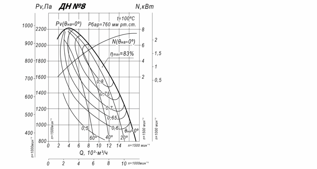 Дымосос ДН №8 изготавливается по 1-ой конструктивной схеме (соединение рабочего колеса с двигателем напрямую) и по 3-ей схеме (рабочее колесо соединяется с электродвигателем при помощи соединительной муфты) исполнения. Полное давление 2250 Па, производительность по воздуху 17000 м3/ч, по исполнению ДН-8 делятся на правые и левые (по направлению вращения рабочего колеса, если смотреть со стороны электропривода). Дутьевой вентилятор ДН №8 одностороннего всасывания предназначен для нагнетания приточного воздуха через газоходы к котельным топкам, в газомазутных котельных установках дымососы могут работать не только на вдув, но и на утилизацию дыма и летучих продуктов горения с максимально допустимой температурой рабочей среды до +200°С.