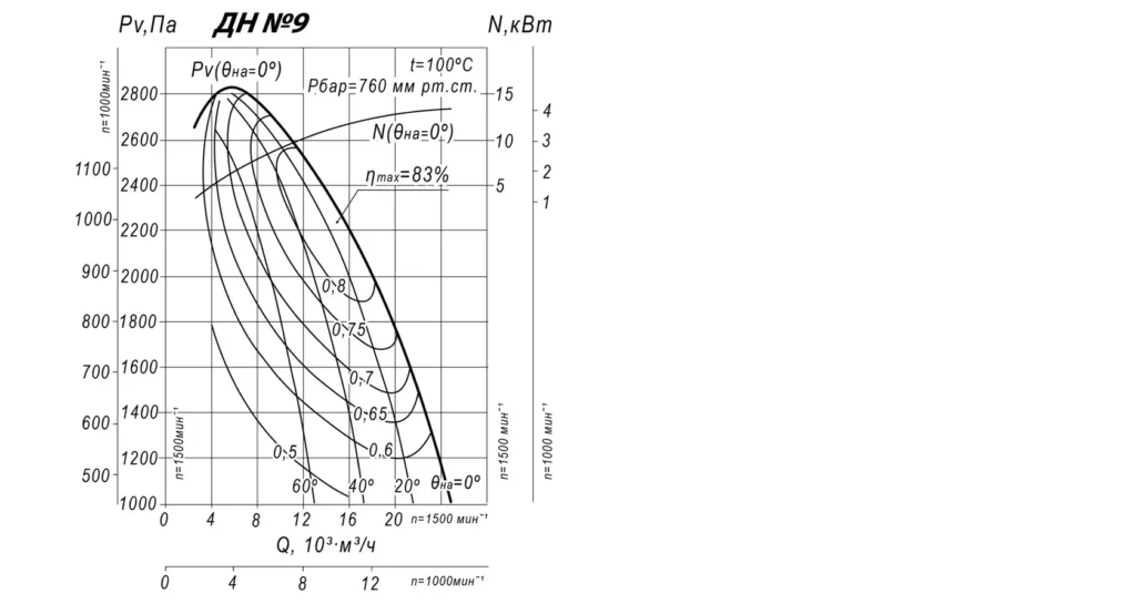 Дымосос ДН №9 изготавливается по 1-ой конструктивной схеме (соединение рабочего колеса с двигателем напрямую) и по 3-ей схеме (рабочее колесо соединяется с электродвигателем при помощи соединительной муфты) исполнения. Полное давление 2850 Па, производительность по воздуху 25000 м3/ч, по исполнению ДН-9 делятся на правые и левые (по направлению вращения рабочего колеса, если смотреть со стороны электропривода). Дутьевой вентилятор ДН №9 одностороннего всасывания предназначен для нагнетания приточного воздуха через газоходы к котельным топкам, в газомазутных котельных установках дымососы могут работать не только на вдув, но и на утилизацию дыма и летучих продуктов горения с максимально допустимой температурой рабочей среды до +200°С.